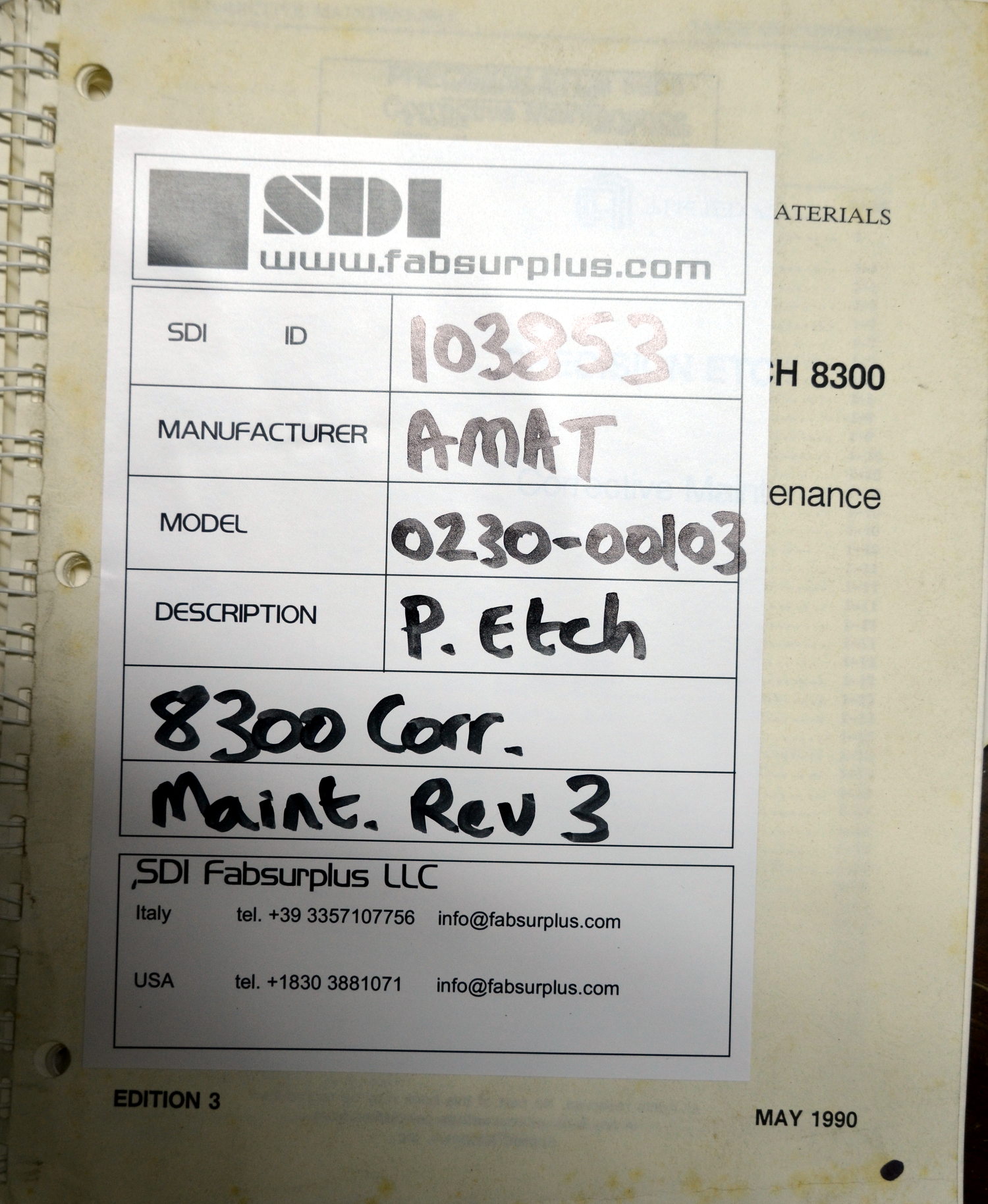 SDI fabsurplus.com is pleased to announce the availability of the following listed used Applied Materials ® 0230-00103 Precision Etch 8300 Corrective Maintenance Rev 3 .