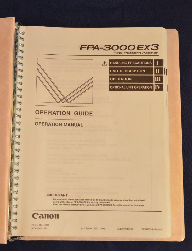SDI fabsurplus.com is pleased to announce the availability of the following listed used Canon BY8-6168-1E0 Canon FPA3000 EX3 Operation Guide - operational manual.