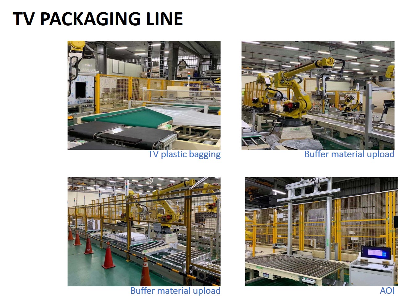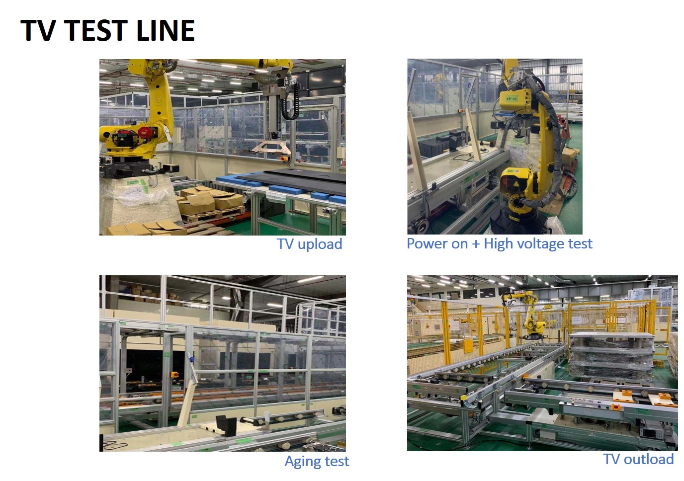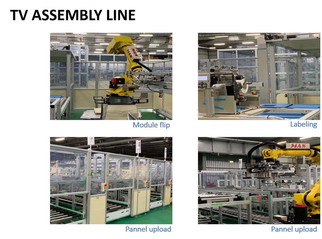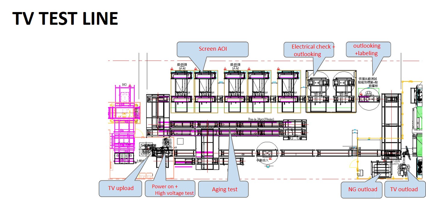 | Comments: | Item ∣ Description ∣ Capacity / Spec ∣ Remark 1 ∣ TV size ∣ 50” ~ 75” 2 ∣ Capacity ∣ 25K/M ∣T/T : 80sec 3 ∣ How to load the material ∣ MGV / AGV 4 ∣ Change mode ∣ Partially automated 5 ∣ Automation ratio ∣ >80% 6 ∣ Industry 4.0 including 1. Module assembly line 2. TV assembly line 3.TV test line 4.TV packaging line 5.TV assembly line Quality inspection system 1.BL API (with AI function)