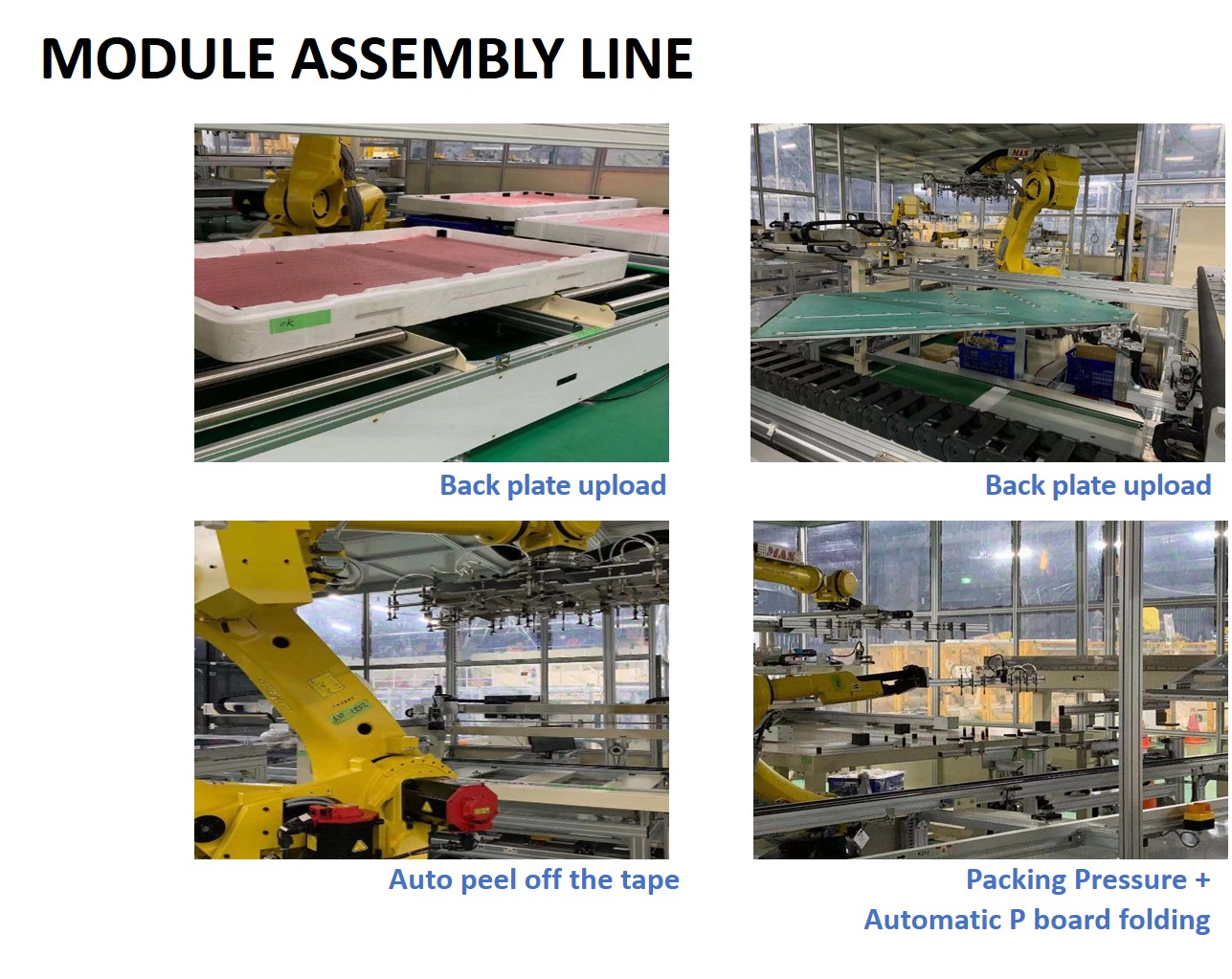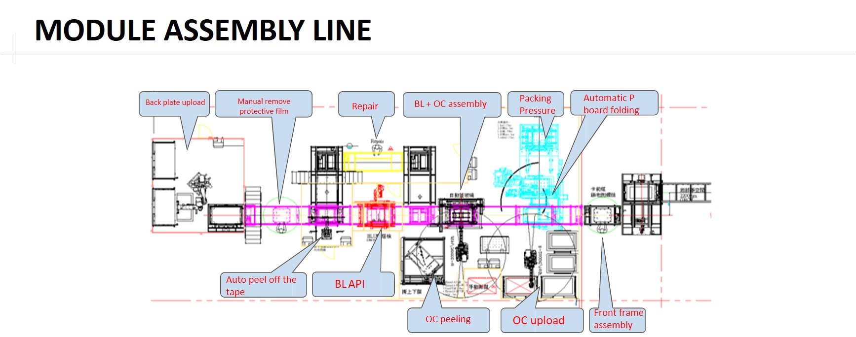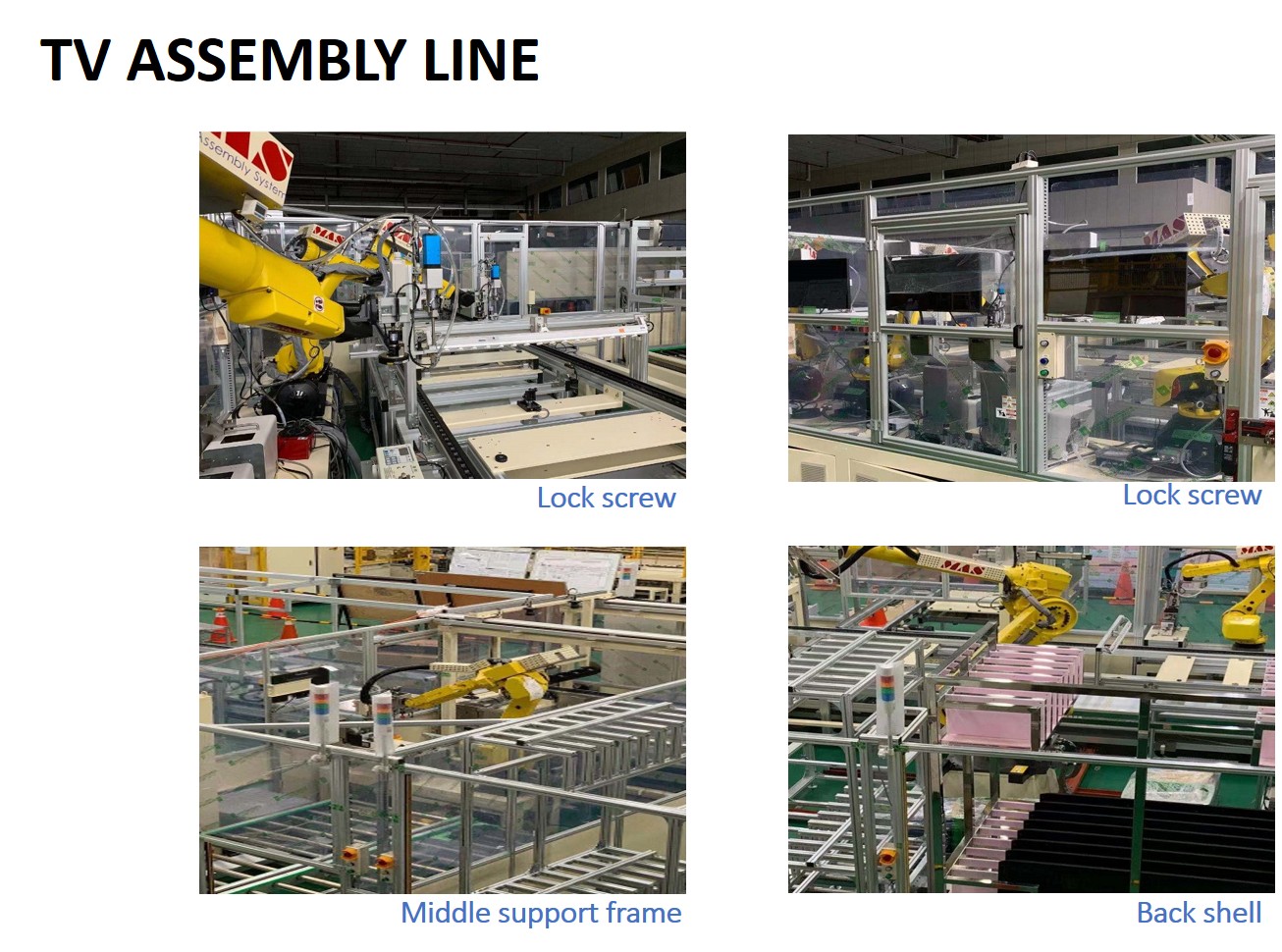| Comments: | Item ∣ Description ∣ Capacity / Spec ∣ Remark 1 ∣ TV size ∣ 50” ~ 75” 2 ∣ Capacity ∣ 25K/M ∣T/T : 80sec 3 ∣ How to load the material ∣ MGV / AGV 4 ∣ Change mode ∣ Partially automated 5 ∣ Automation ratio ∣ >80% 6 ∣ Industry 4.0 including 1. Module assembly line 2. TV assembly line 3.TV test line 4.TV packaging line 5.TV assembly line Quality inspection system 1.BL API (with AI function)