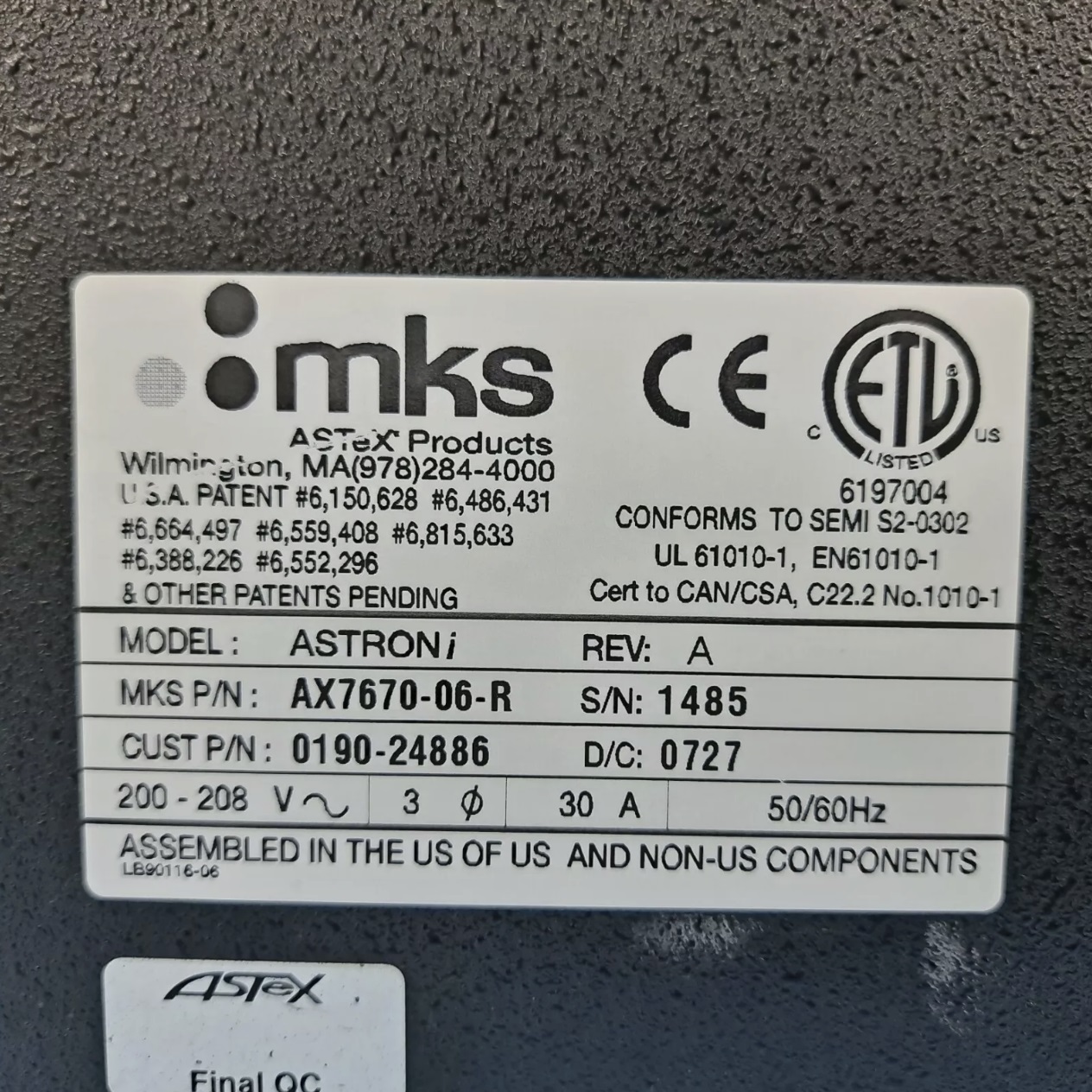 Please click on the "Get Quote" button at the end of the ASTRON AX7670 description, if you'd like to get a quotation, photos and specifications of this Remote Plasma Cleaning Unit (RPS), and your request for this equipment will be forwarded to our SDI sales representatives automatically.