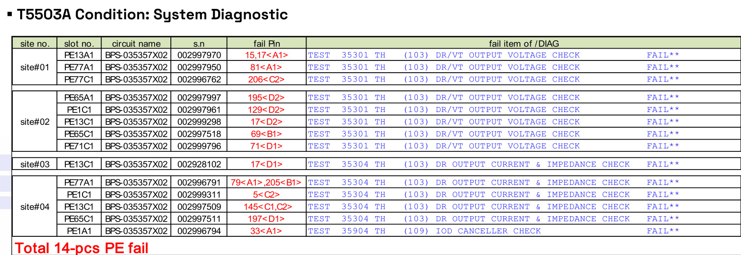 | Comments: | T5503A (8,448CH TH) Specification: Max Frequency: 1.143 GHz / 2.286 Gbps Accuracy OTA [+/- 75ps [SBCAL] Dr/Cp skew 60ps p-p TH Channels DR pin 3840+768 ch I/O pin 3072 ch Level DR pin 768 ch PPS ch 1024+256 ch DC ch 128 ch Station 1 STN size W xD xH MF 2400 x 1050 x 1800 TH 870 x 1500 x 630 Power consumption 97kVA / system Power Lines 8 lines (200VAC three-phase) Cooling water 2 lines System software FutureSuite ( 4.09G-1 ) Advantest MB For T5503A Product: HIFIX(Mother Board) Model: KH7-010325 and KH7-010326 Some channels fail diagnostics. Please refer to attached image for details of failing channels. |
