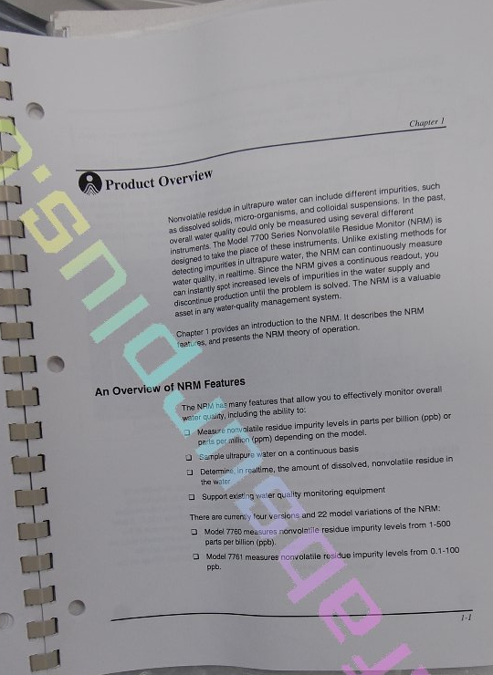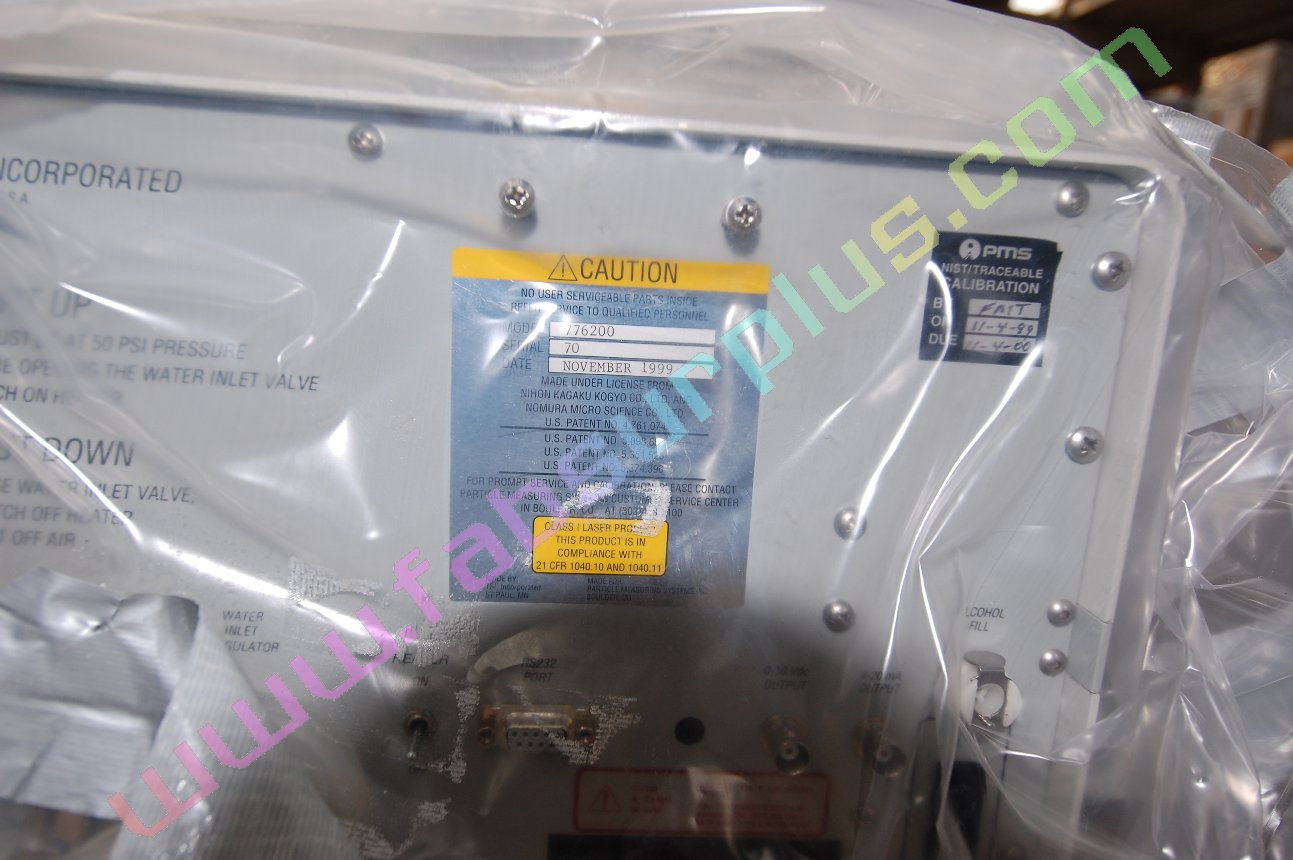 | Comments: | Detects non-volatile residue in ultrapure water. Allows continuous monitoring in real time. Main features:- -measures impurity levels in PPD or PPM depending on the model -this model, 7762, measures impurities in the range 10 PPT to 10 PPB Located At Avezzano, Italy. CE Marked serial number 70. Object of measurement: detection of nonvolatile impurity concentration in ultrapure water Method: Water droplet atomization and subsequent drying to recover non-volatile residue Model 7762 Detection range: 10 ppt to 10 ppb Calibration Method: Calibration checked by AAS analysis of pure KCl in water sample flow rate: 0.875 mL/min max external water inlet pressure: 483 kPa (80 psi). TOTAL FLOWRATE: BETWEEN 50-80 Ml/MIN AT 138-207 Kpa (20-30 PSI) WATER TEMP: 20-50 C ambient temp: 15-35 C Humidity: should be less than 85% Response time: within 3.25 minutes from the time the sample reaches water inlet to 95% of final stabilized reading Internal feedwater pressure: 138-207 kPa Accuracy: +/-10% of KCl in water by AAS analysis Residue drying temp: 120 C (optional settings 95, 70 and 45 C). Output: RS 232, serail, BNC analog (0-10V, 4-20mA) Can drive a load of 450 ohms sampling time: 1 sec on NRM display, 20 sec on computer display Power switchable 115/230/240V +/- 10%, 50/60 Hz 1.5 amp Material in contact with water: PFA Teflon, 316 stainless, sapphire Dimensions: 51.4 x 43,2 x 23.2 cm weight: 25 KG Environmental conditions: -Indoor use -up to 2000 m -temperature 4-20 C -humidity 0-90% -overvoltage cat. 2 -Pollution degree cat. 2 Injection valve options *********************** Stator: PEEK Flat stator face: polished alumina ceramic Single-point pressure adjusting screw located at the shaft end of the valve Standard rotor seal tolerance: Entire pH from 0-14 Max temperature: 50C Pressure rating: 34 MPa (5000 psi) Max operating torque: 17 kg/cm; 10 kg/cm is typical -CE Marked -Includes operatons and service manuals Includes: service manual p/n 1977701 |