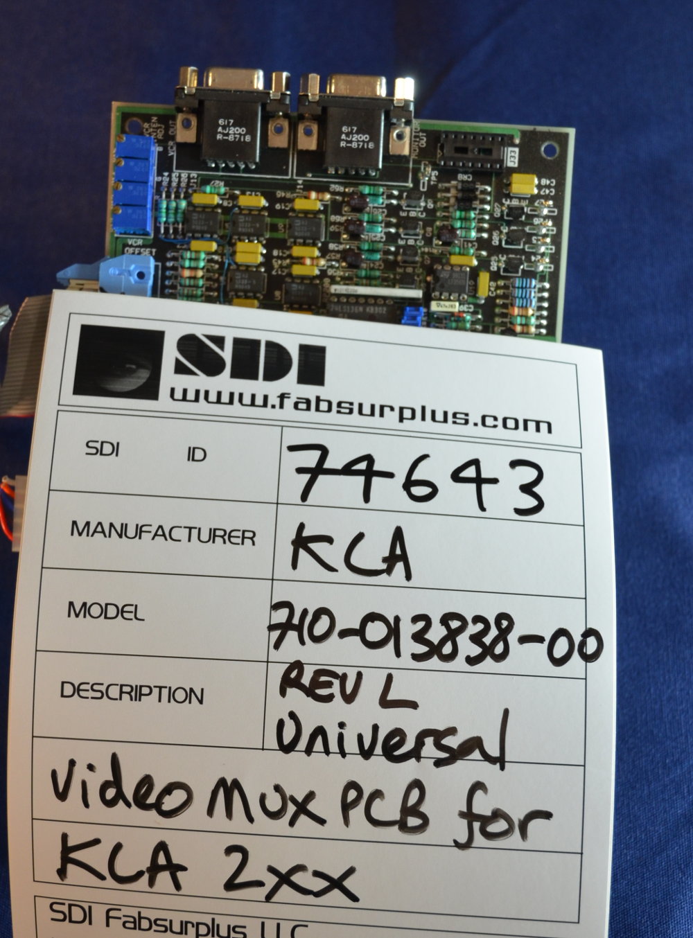 SDI fabsurplus.com is pleased to announce the availability of the following listed used KLA-Tencor 710-013838-00 Rev L PCB Universal Video Mux for KLA 2xx reticle inspection systems.