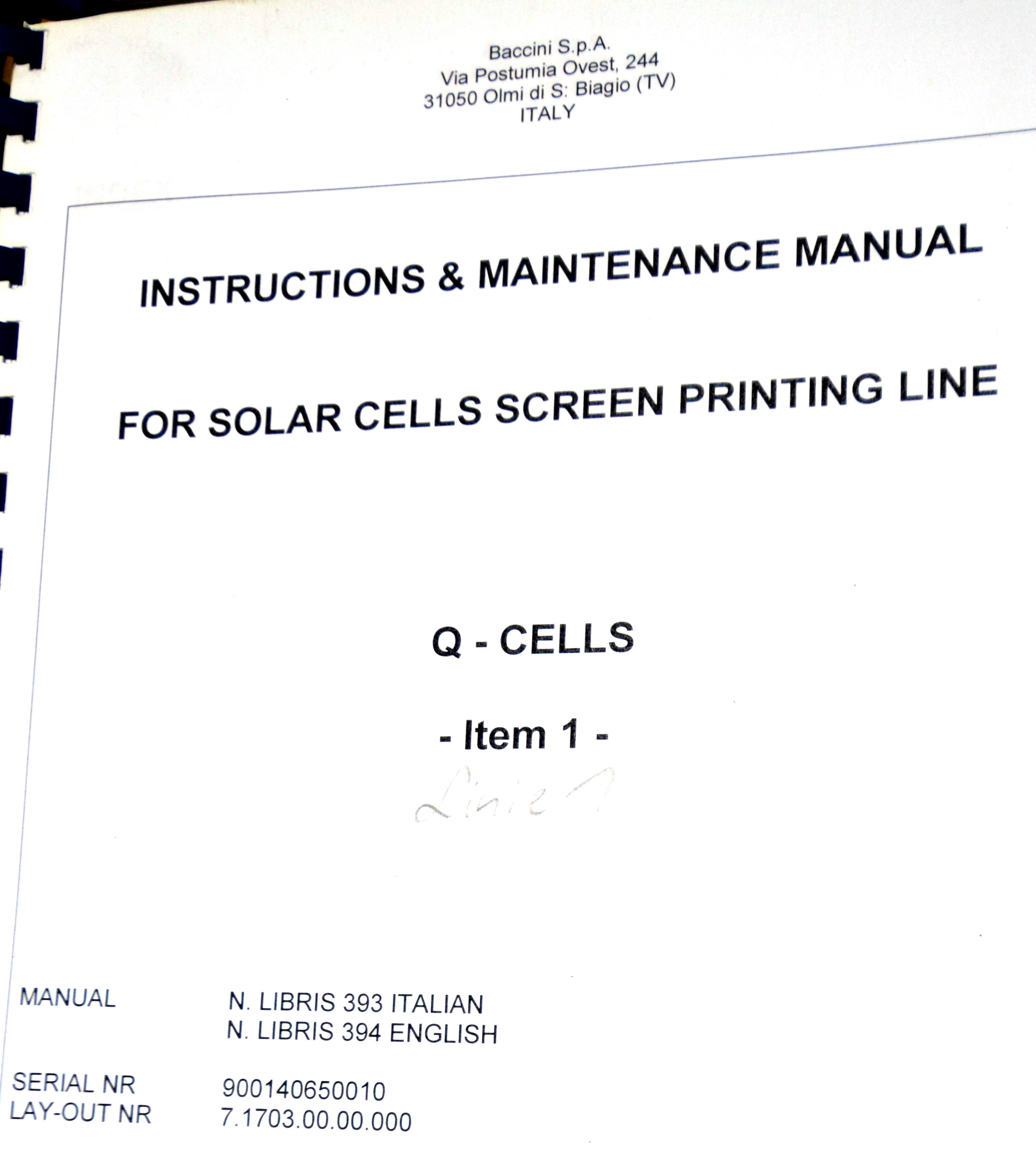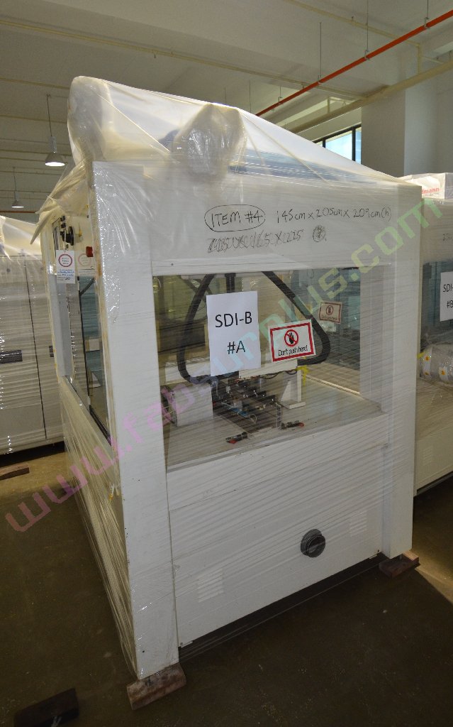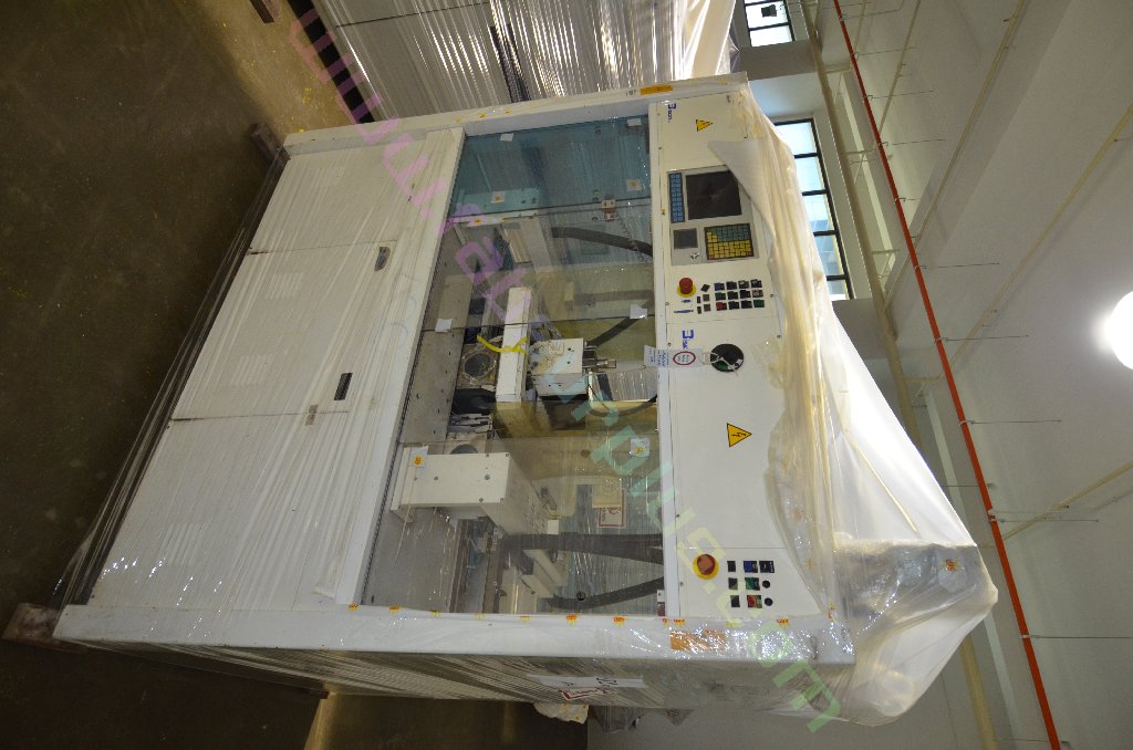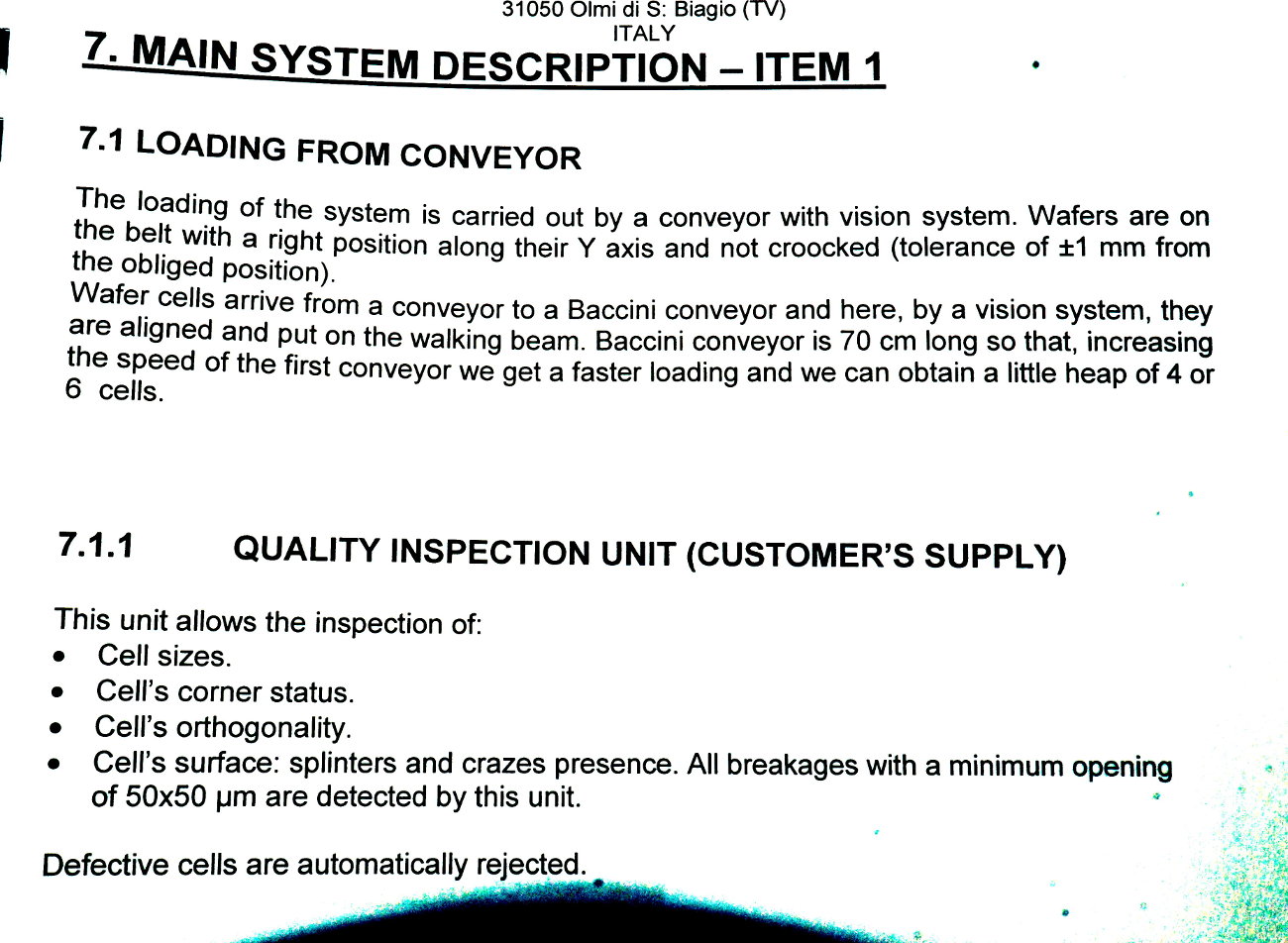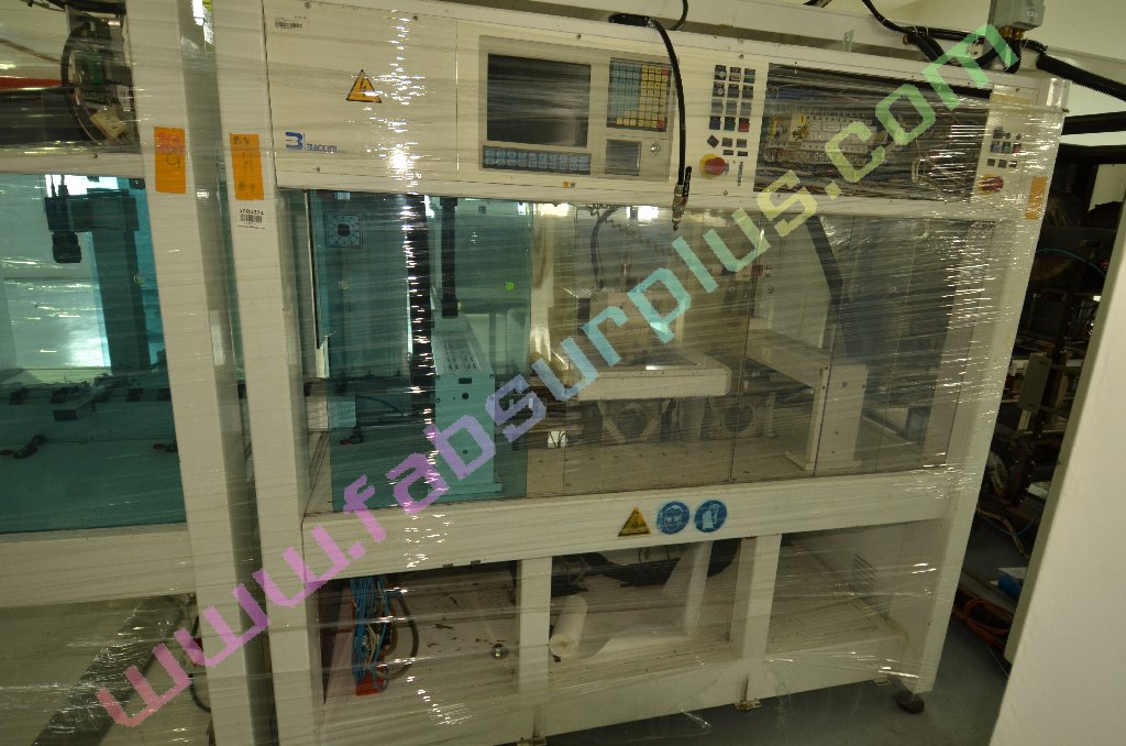 | Comments: | Integrated printers and dryers for the production of 156 mm square solar cells. The integrated dryers and printers are fed via a Jonas and Redmann loader. The J and R loader actually loads onto a Chip and Crack detection system, which then feeds into the first printer. 3 printers 2 Dryers Soft Line. Loaders: Printer 1 Dryer 1 Printer 2 Dryer 2 Printer 3 Operational prior to de-installation In-line with Baccini Solar Cell Line 156mm Single Lane process. S/N 900140650010 LAYOUT 7.1703.00.00.000 CE Marked All manuals and software disks included. WEIGHT AND DIMENSIONS: 145 cm x 205 cm x 209 cm (h) , weight 1000 kg Attached also is the layout of the complete line. The loader for the line is manufactured by Jonas and Redmann. The 3rd printer unloaded directly onto the input table of the Centrotherm Fast Firing Furnace, which was the next element in the line. The printers and dryers were re-furbished, re-located and re-installed by Applied Baccini in 2011. Attached is the install report. Following re-installation, only a very small quantity of pilot production was run. The line was de-installed in february 2012. The line has been dis-assembled and cleaned. It is now in storage in Singapore Woodlands. This system is used for the production of solar cells by the silk-screen printing process. This process allows the production of: -Conductors -Resistors -Dieelectrics -Glass protections -Cross-overs The loading of the system is carried out by a conveyer with vision system. Wafer cells arrive from a conveyer to a Baccini conveyer and here, by a vision system the cells are aligned and put on a walking beam, by adjusting the speed of the first conveyer you can obtain loading heaps of 4 or 6 cells. Printing head resolution is approx 0.5nm Technical Specifications ------------------------ Installation environment: 18 - 25 deg C Max relative Moisture: 70% Overall Size: Base: 15,995 x 2451.5 mm Height: 2,250mm A) Production -Cell Size: 100x100mm,125x125mm,150x150mm -Cell Thickness min-max 200nm - 330 -Max cells working per hour: 1,125 cells/hr (Squeegee speed: 100mm/sec) -Max cells breakage percentage: max 0.5% -Line availability: >95% D) First Printing Machine -Max horidontal squeegee stroke: 240mm -Squeegee speed min-max: mm/s 0-333 -max vertical squeegee stroke: 33mm -squeegee pressure N 0-150 -squeegee pressure accuracy: +/- 0.2N -Maximum printing area: 210x210mm -maximum printing screen size: 380x460mm E) Drying vertical oven -Number of cells per each shelf n.5 -total number of shelves n.52 -number of temperature control zones n.4 -settled temperature tolerance +/- 5deg C -max operating temperature in the oven: 250deg C -min operating temperature in the oven: 40deg C -paste levelling and pre-heating time: min.2 -drying time min.5 -cooling time min.2 h) Feeding -electrical feeding 400V +/- 10% 3-Phase+PE(3 phases wires +1 ground PE), 50hz -installed electrical power: 32KW -compressed air supply: Bar 6 -Compressed air consumption nl/min 250 -Vacuum supply: mm Hg 600 -Vacuum suction capacity: mc/h 25 Breakages in the quality inspection unit can detect splinters and crazes presence, with a minimum opening of 50x50nm are detected. Defective cells are automatically rejected. |