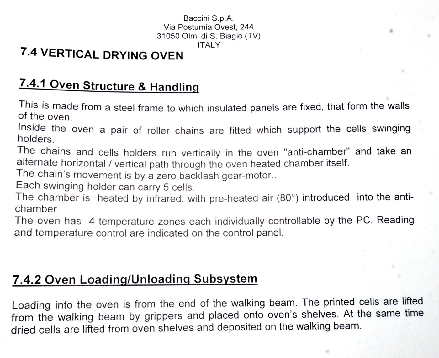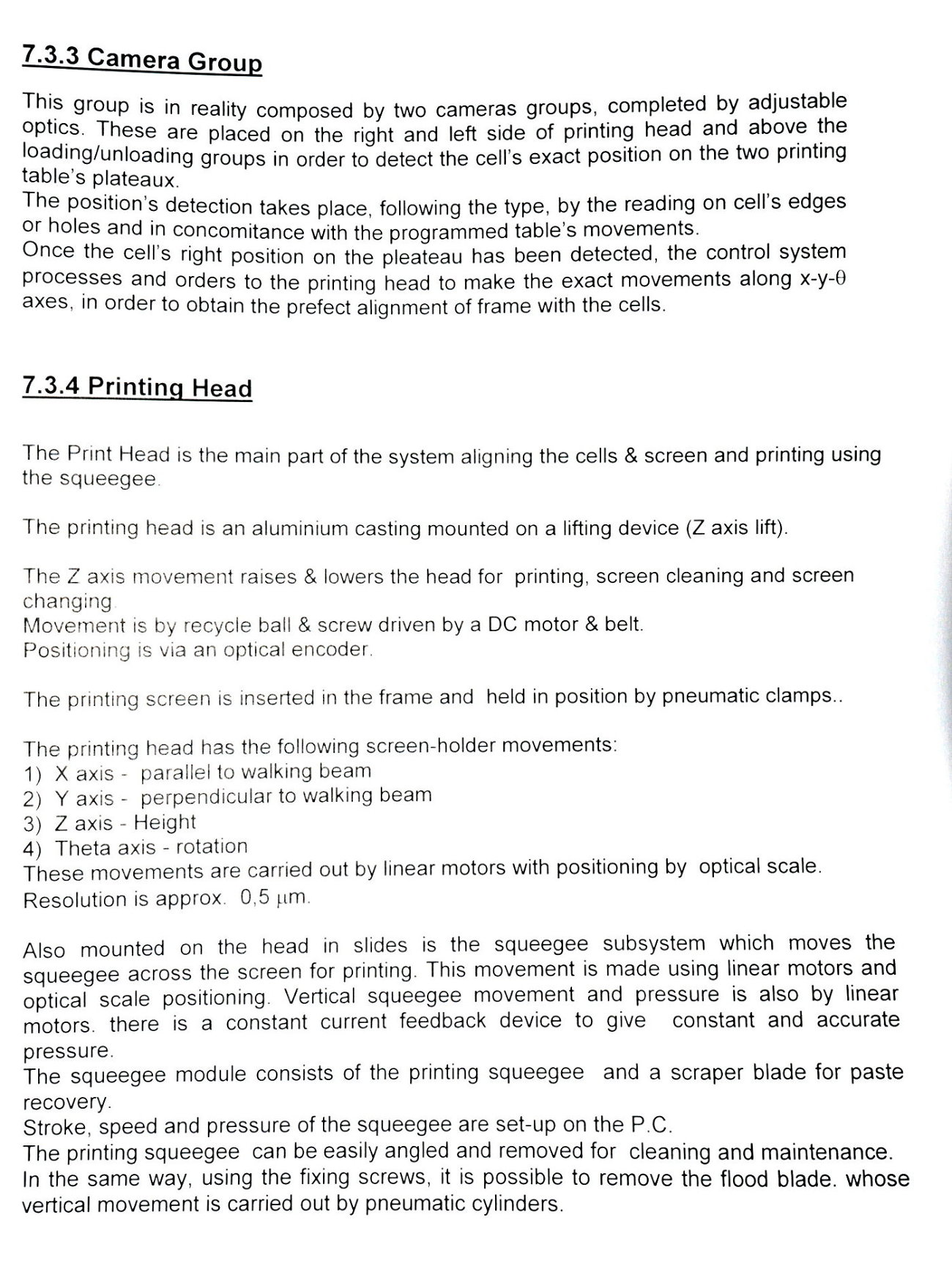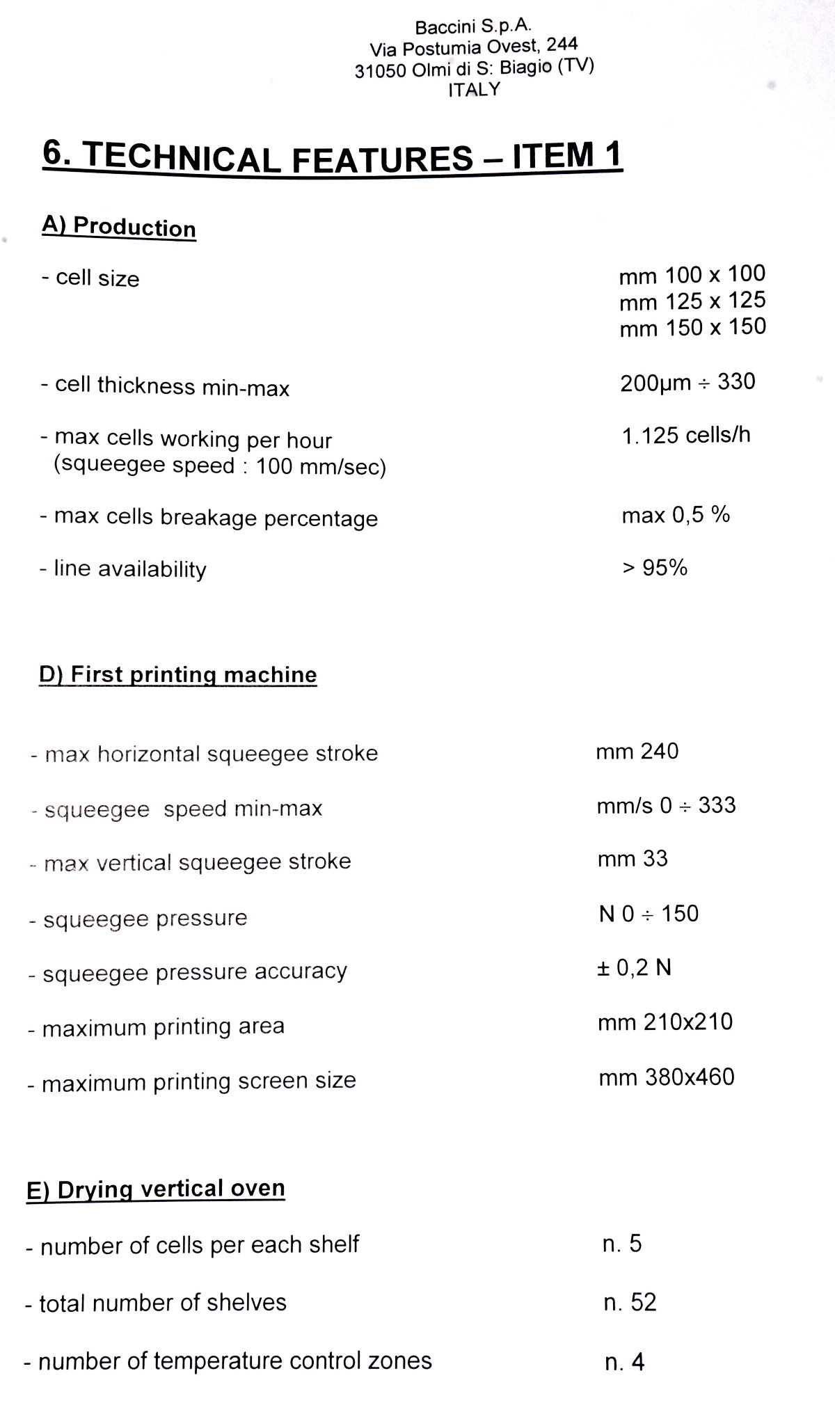 | Comments: | Integrated printers and dryers for the production of 156 mm square solar cells. The integrated dryers and printers are fed via a Jonas and Redmann loader. The J and R loader actually loads onto a Chip and Crack detection system, which then feeds into the first printer. 3 printers 2 Dryers Soft Line. Loaders: Printer 1 Dryer 1 Printer 2 Dryer 2 Printer 3 Operational prior to de-installation In-line with Baccini Solar Cell Line 156mm Single Lane process. S/N 900140650010 LAYOUT 7.1703.00.00.000 CE Marked All manuals and software disks included. WEIGHT AND DIMENSIONS: 145 cm x 205 cm x 209 cm (h) , weight 1000 kg Attached also is the layout of the complete line. The loader for the line is manufactured by Jonas and Redmann. The 3rd printer unloaded directly onto the input table of the Centrotherm Fast Firing Furnace, which was the next element in the line. The printers and dryers were re-furbished, re-located and re-installed by Applied Baccini in 2011. Attached is the install report. Following re-installation, only a very small quantity of pilot production was run. The line was de-installed in february 2012. The line has been dis-assembled and cleaned. It is now in storage in Singapore Woodlands. This system is used for the production of solar cells by the silk-screen printing process. This process allows the production of: -Conductors -Resistors -Dieelectrics -Glass protections -Cross-overs The loading of the system is carried out by a conveyer with vision system. Wafer cells arrive from a conveyer to a Baccini conveyer and here, by a vision system the cells are aligned and put on a walking beam, by adjusting the speed of the first conveyer you can obtain loading heaps of 4 or 6 cells. Printing head resolution is approx 0.5nm Technical Specifications ------------------------ Installation environment: 18 - 25 deg C Max relative Moisture: 70% Overall Size: Base: 15,995 x 2451.5 mm Height: 2,250mm A) Production -Cell Size: 100x100mm,125x125mm,150x150mm -Cell Thickness min-max 200nm - 330 -Max cells working per hour: 1,125 cells/hr (Squeegee speed: 100mm/sec) -Max cells breakage percentage: max 0.5% -Line availability: >95% D) First Printing Machine -Max horidontal squeegee stroke: 240mm -Squeegee speed min-max: mm/s 0-333 -max vertical squeegee stroke: 33mm -squeegee pressure N 0-150 -squeegee pressure accuracy: +/- 0.2N -Maximum printing area: 210x210mm -maximum printing screen size: 380x460mm E) Drying vertical oven -Number of cells per each shelf n.5 -total number of shelves n.52 -number of temperature control zones n.4 -settled temperature tolerance +/- 5deg C -max operating temperature in the oven: 250deg C -min operating temperature in the oven: 40deg C -paste levelling and pre-heating time: min.2 -drying time min.5 -cooling time min.2 h) Feeding -electrical feeding 400V +/- 10% 3-Phase+PE(3 phases wires +1 ground PE), 50hz -installed electrical power: 32KW -compressed air supply: Bar 6 -Compressed air consumption nl/min 250 -Vacuum supply: mm Hg 600 -Vacuum suction capacity: mc/h 25 Breakages in the quality inspection unit can detect splinters and crazes presence, with a minimum opening of 50x50nm are detected. Defective cells are automatically rejected. |