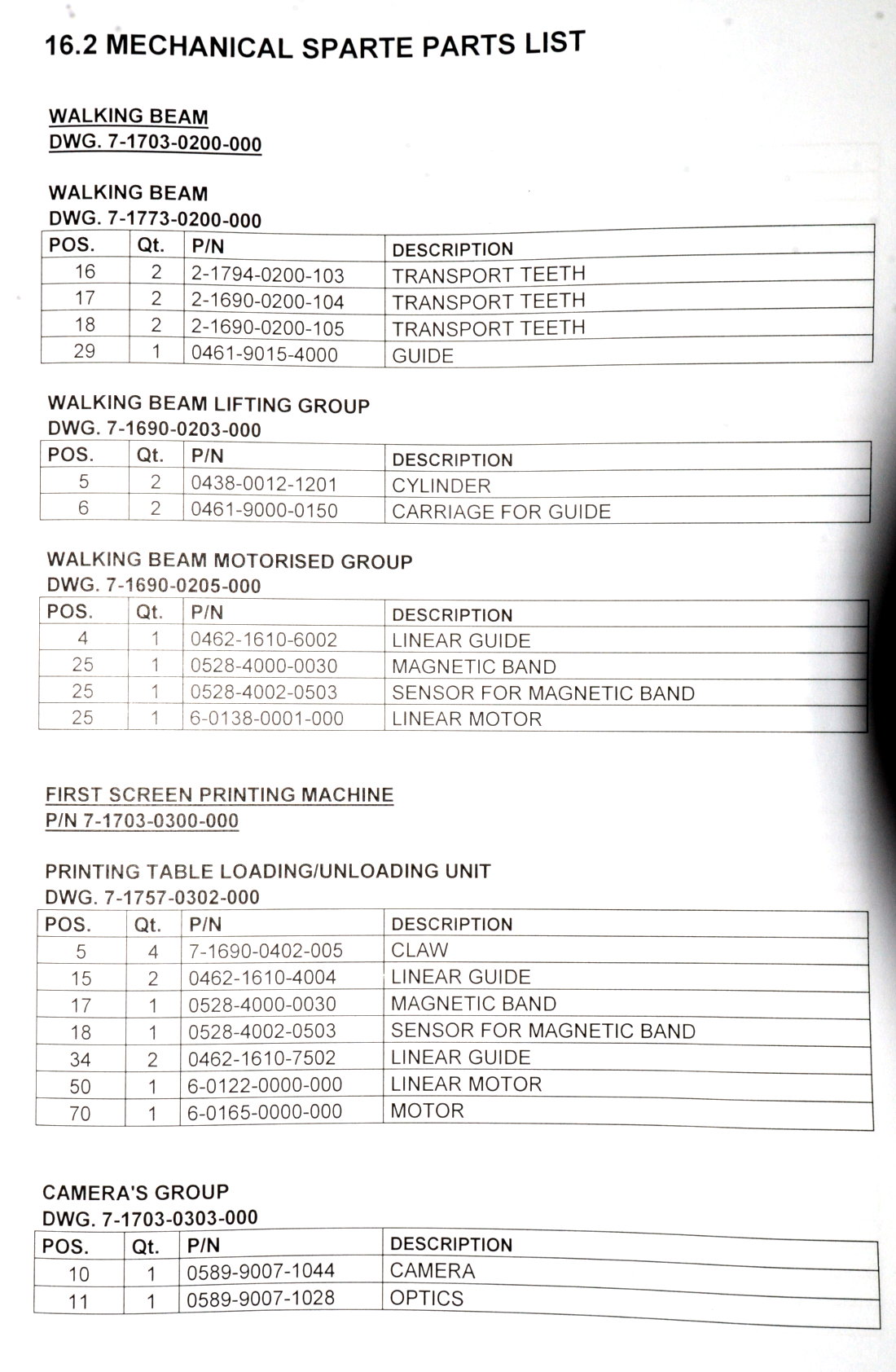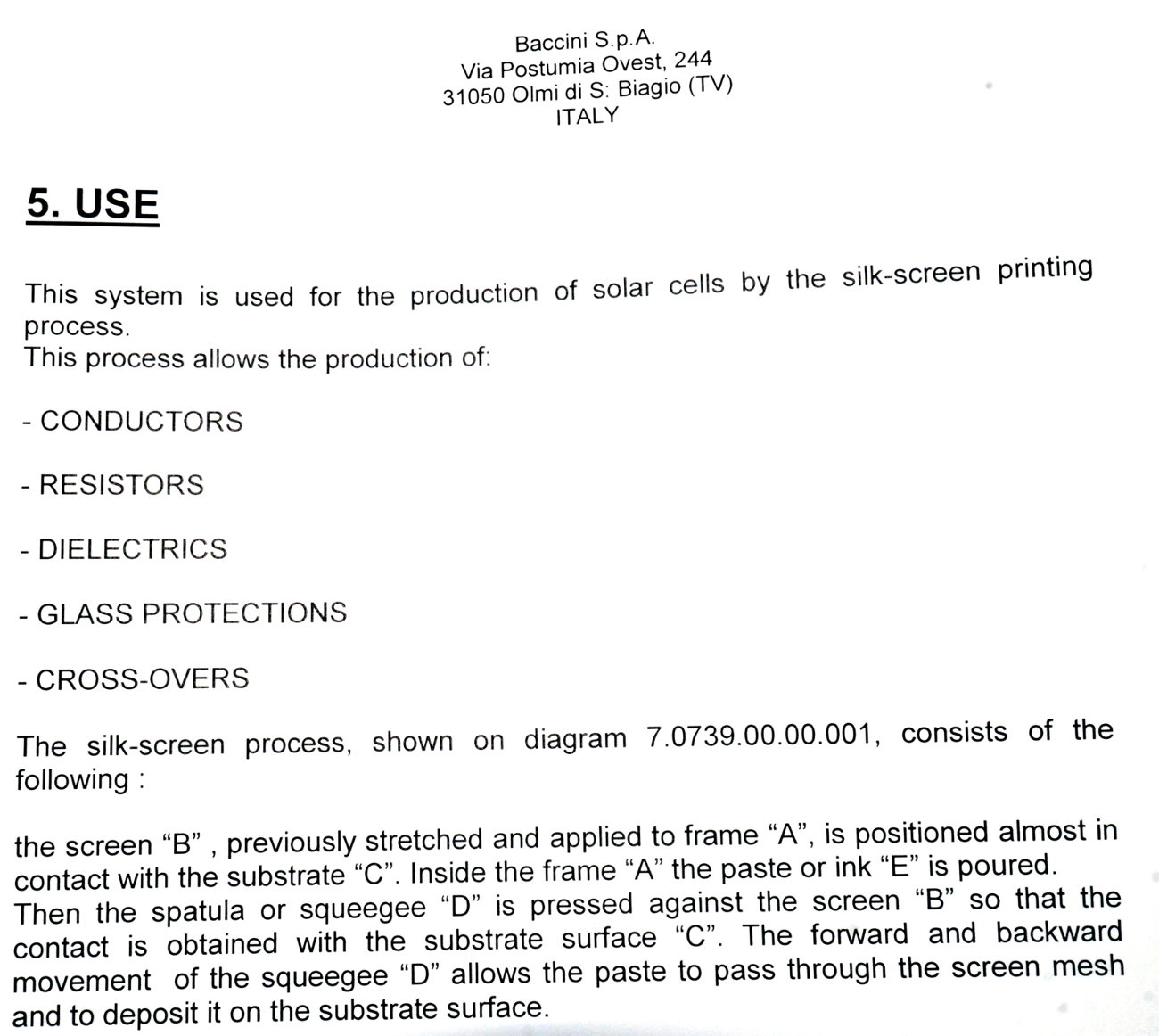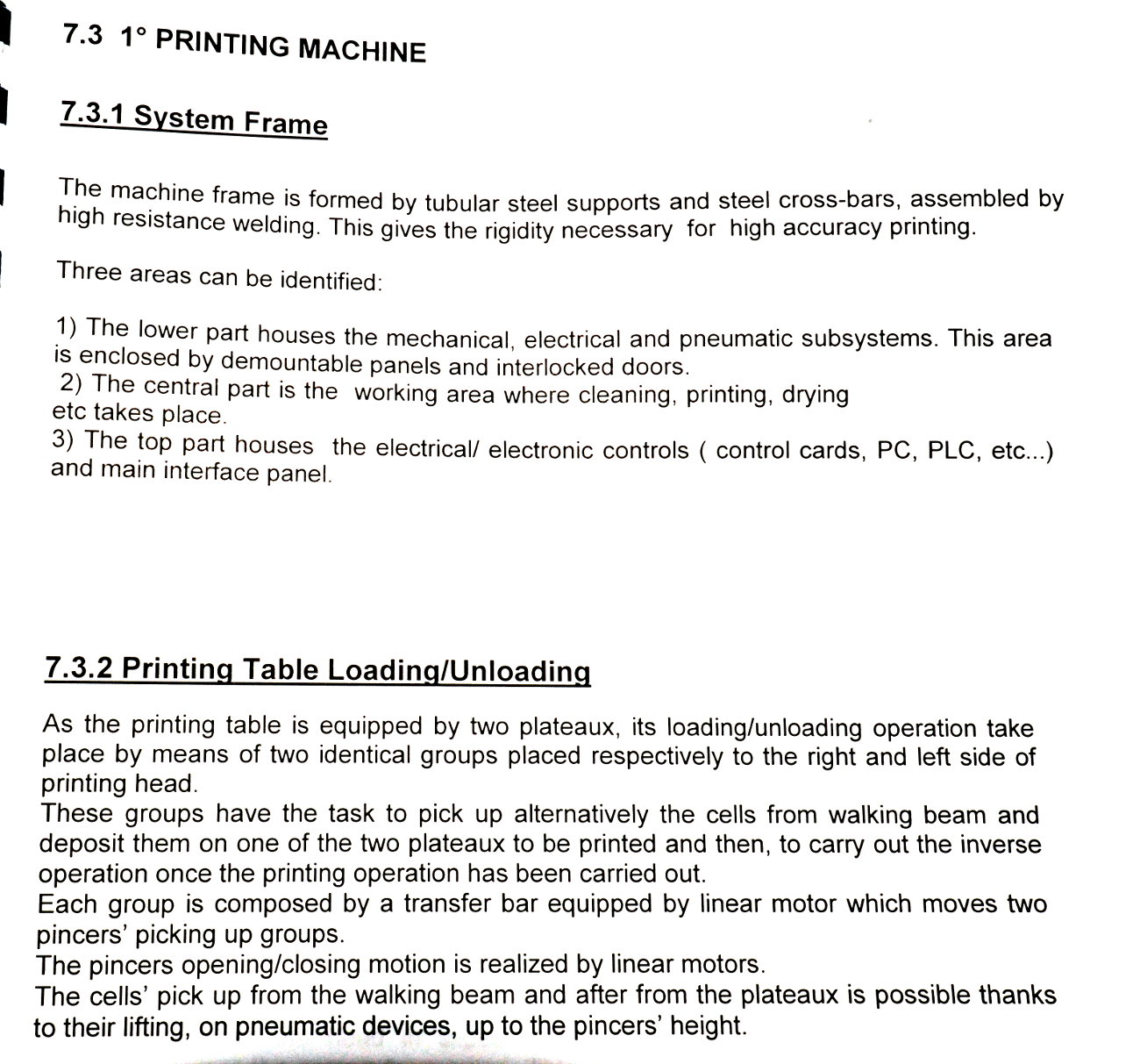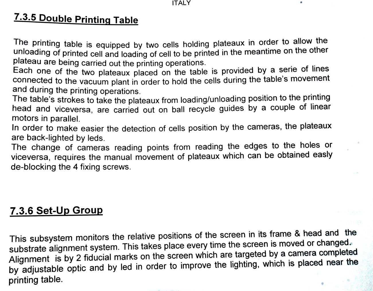 | Comments: | Integrated printers and dryers for the production of 156 mm square solar cells. The integrated dryers and printers are fed via a Jonas and Redmann loader. The J and R loader actually loads onto a Chip and Crack detection system, which then feeds into the first printer. 3 printers 2 Dryers Soft Line. Loaders: Printer 1 Dryer 1 Printer 2 Dryer 2 Printer 3 Operational prior to de-installation In-line with Baccini Solar Cell Line 156mm Single Lane process. S/N 900140650010 LAYOUT 7.1703.00.00.000 CE Marked All manuals and software disks included. WEIGHT AND DIMENSIONS: 145 cm x 205 cm x 209 cm (h) , weight 1000 kg Attached also is the layout of the complete line. The loader for the line is manufactured by Jonas and Redmann. The 3rd printer unloaded directly onto the input table of the Centrotherm Fast Firing Furnace, which was the next element in the line. The printers and dryers were re-furbished, re-located and re-installed by Applied Baccini in 2011. Attached is the install report. Following re-installation, only a very small quantity of pilot production was run. The line was de-installed in february 2012. The line has been dis-assembled and cleaned. It is now in storage in Singapore Woodlands. This system is used for the production of solar cells by the silk-screen printing process. This process allows the production of: -Conductors -Resistors -Dieelectrics -Glass protections -Cross-overs The loading of the system is carried out by a conveyer with vision system. Wafer cells arrive from a conveyer to a Baccini conveyer and here, by a vision system the cells are aligned and put on a walking beam, by adjusting the speed of the first conveyer you can obtain loading heaps of 4 or 6 cells. Printing head resolution is approx 0.5nm Technical Specifications ------------------------ Installation environment: 18 - 25 deg C Max relative Moisture: 70% Overall Size: Base: 15,995 x 2451.5 mm Height: 2,250mm A) Production -Cell Size: 100x100mm,125x125mm,150x150mm -Cell Thickness min-max 200nm - 330 -Max cells working per hour: 1,125 cells/hr (Squeegee speed: 100mm/sec) -Max cells breakage percentage: max 0.5% -Line availability: >95% D) First Printing Machine -Max horidontal squeegee stroke: 240mm -Squeegee speed min-max: mm/s 0-333 -max vertical squeegee stroke: 33mm -squeegee pressure N 0-150 -squeegee pressure accuracy: +/- 0.2N -Maximum printing area: 210x210mm -maximum printing screen size: 380x460mm E) Drying vertical oven -Number of cells per each shelf n.5 -total number of shelves n.52 -number of temperature control zones n.4 -settled temperature tolerance +/- 5deg C -max operating temperature in the oven: 250deg C -min operating temperature in the oven: 40deg C -paste levelling and pre-heating time: min.2 -drying time min.5 -cooling time min.2 h) Feeding -electrical feeding 400V +/- 10% 3-Phase+PE(3 phases wires +1 ground PE), 50hz -installed electrical power: 32KW -compressed air supply: Bar 6 -Compressed air consumption nl/min 250 -Vacuum supply: mm Hg 600 -Vacuum suction capacity: mc/h 25 Breakages in the quality inspection unit can detect splinters and crazes presence, with a minimum opening of 50x50nm are detected. Defective cells are automatically rejected. |