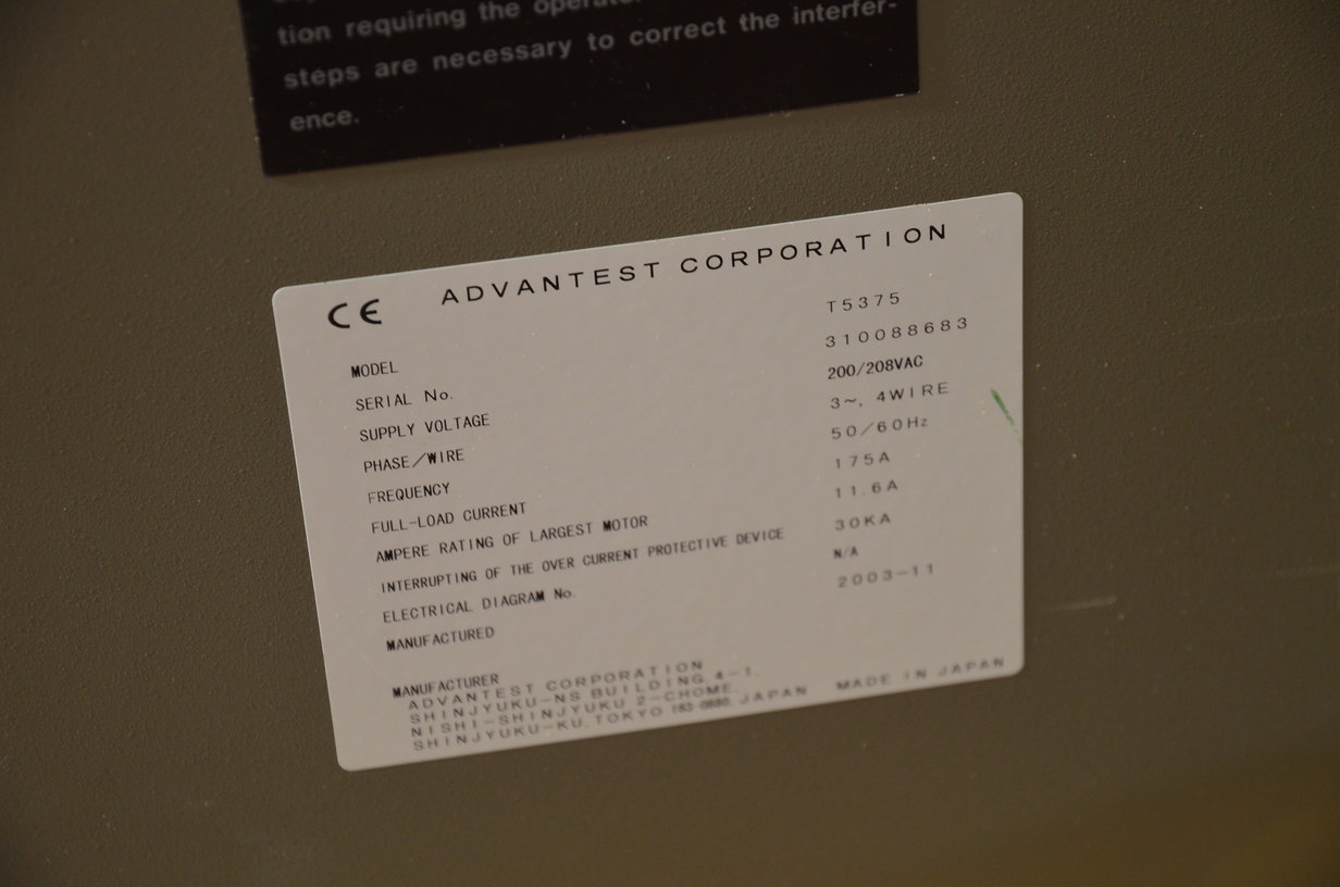 | Comments: | -DE-INSTALLED AND WAREHOUSED. WAS WORKING BEFORE REMOVAL. SOLD "AS IS" CONDITIONS, EX-WAREHOUSE, ITALY. -see attached photos for details. -Number of hours of operation registered on the hour meter: 73,342 hours The Advantest T5375 is a Memory Test System designed for High-Throughput Testing for 300mm Front-end DRAMS and High-Speed Back-end Flash Memories System Configuration Details:- -Configuration:- DIAG G:- Configuration T5375 Data log print out: